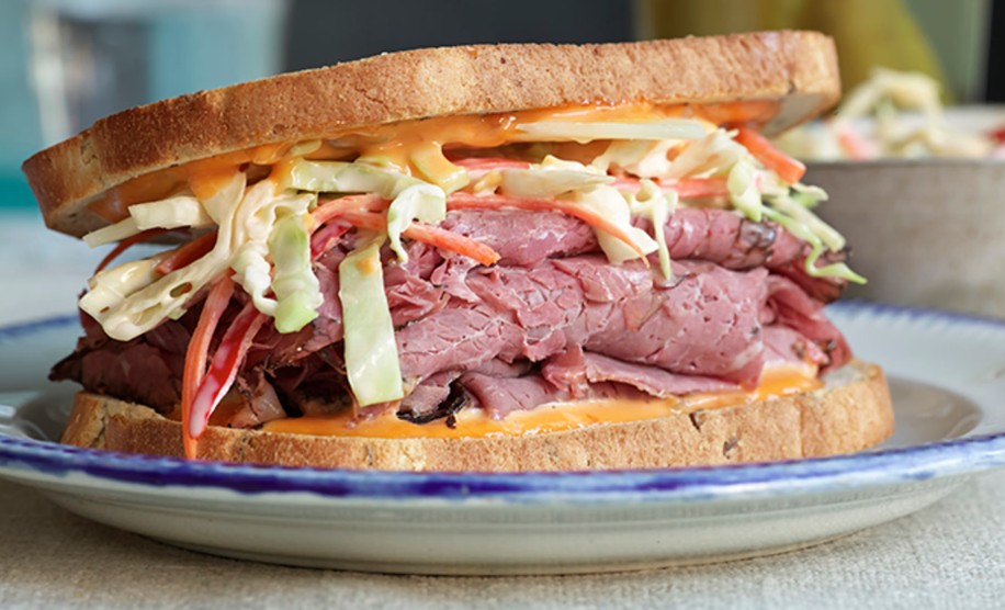Thick-cut pastrami piled high on rye bread with mustard is deli perfection. Smoky, peppery, and juicy, this sandwich showcases the art of cured meat. Katz’s Delicatessen in Manhattan made it famous, but versions across the country carry the same bold spirit.